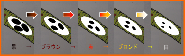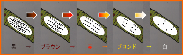 メラニン色素の多い順に、「濃こげ茶→こげ茶→薄こげ茶→くすんだ金→白」