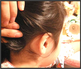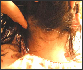 毛髪の密集した人頭ジャングルは、アタマジラミにとって、まさに「オン・ステージ」です。このステージでのアタマジラミの逃げ足はとても速く、寄生数が少ない場合の発見は困難です。そのため、「成虫の追跡」よりも「卵さがし」が最適な発見方法といえます。その「卵さがし」に適した箇所は「耳まわり」と「えりあし」です。