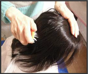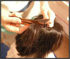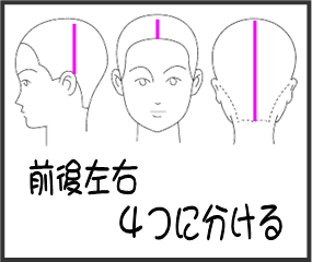 この作業前に、「とかし残し」のないよう、作業順序を決めます。両耳の後ろから頭頂部を結ぶように前後に分け、額の生え際からえりあしまでセンターで分けます。